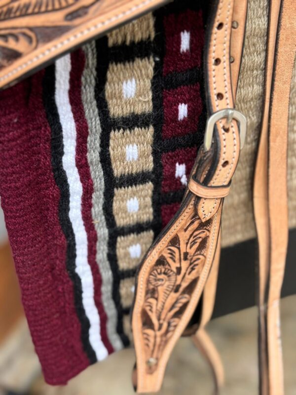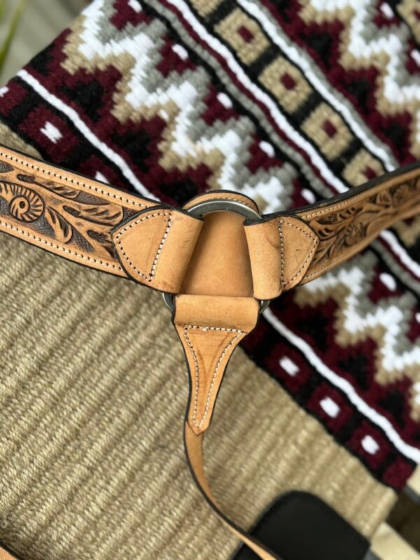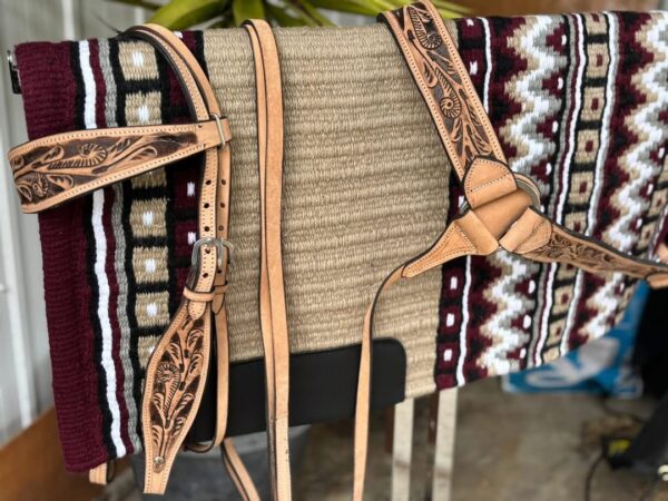 Turn out in confidence with this stunning light tan hand-tooled split rein bridle and matching breastplate. Crafted from premium full-grain leather, every detail showcases true artistry—built to last and designed to stand out.